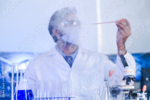 An Indian scientist in a lab coat carefully examines a sample during a pharmaceutical research and development process. Concept for scientific discovery and innovation.
