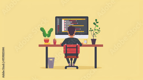 An individual engages in coding at a clean desk, surrounded by greenery in an organized and cheerful workspace