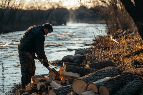 An individual is captured splitting wood beside a gently flowing river during sunset, reflecting themes of labor, nature's beauty, and harmony with the environment.