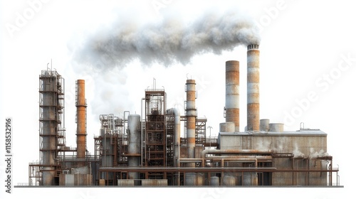 An industrial complex with smokestacks emitting smoke, showcasing the manufacturing process and environmental impact of factories.