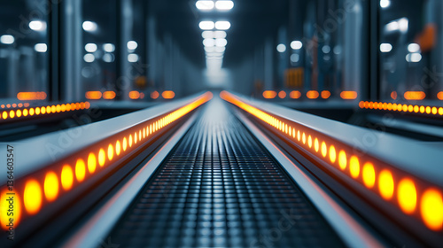 An industrial corridor lined with illuminated orange lights, creating a futuristic and sleek atmosphere.