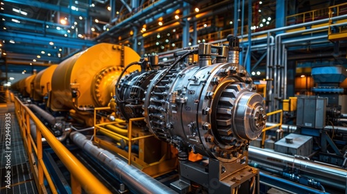 An industrial engine in a factory shop, suitable for illustrating industrial processes and technology.