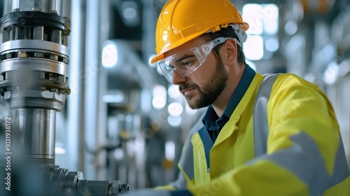 An industrial engineer on-site, performing a safety inspection of newly installed hydraulic equipment