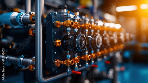 An industrial machine with complex piping and connections is illuminated by a warm glow in a factory setting.