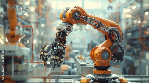 An industrial robot powered by solar energy, performing tasks in a sustainable manufacturing facility.