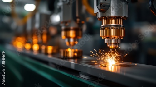 An industrial scene showcasing precision laser cutting in a factory, characterized by bright sparks and modern machinery, representing innovation and technology in manufacturing.
