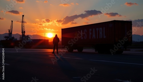 an industrial setting at sunset with a person standing by a truck parked in front of a shipping container