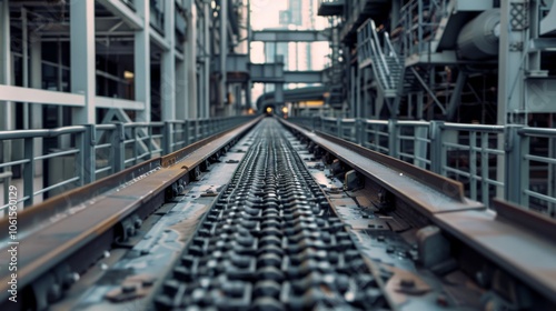 An industrial setting with railroad tracks leading into the distance, flanked by massive steel structures, encapsulates strength and endless possibility.