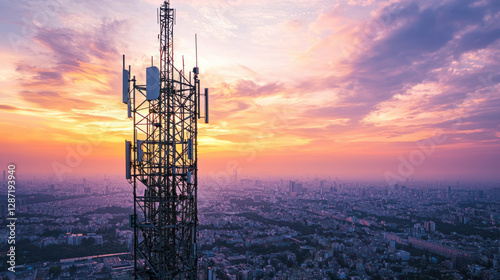 An Innovative communication tower at sunset, showcasing high speed internet technology