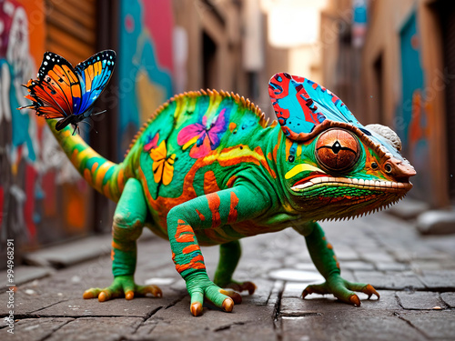 an innovative creation of an authentic whimsical chameleon with interesting texture pattons on its skin, with big interesting butterfly pattons on the wings - generated by ai