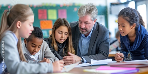 An instructor attentively guides a group of four diverse middle school students through a collaborative study session, fostering a positive and engaging learning environment.