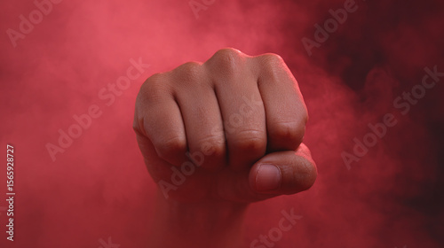 An Intense Close-Up of a Clenched Fist Symbolizing Strength and Determination Amidst a Dramatic Background of Smoke and Color, Capturing States of Mind and Emotions