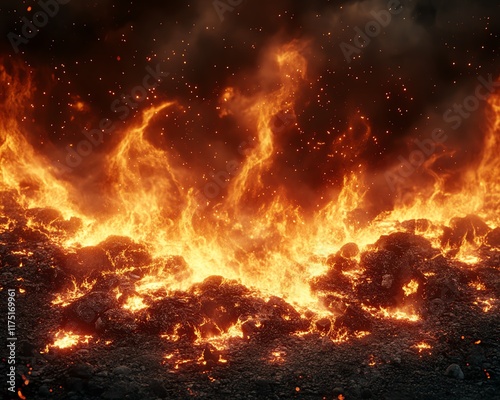 An intense closeup of burning charcoal, with vivid flames and glowing embers, ideal for a fiery barbecue scene