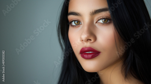 An intense close-up portrait of a young Hispanic woman with long black hair, her piercing eyes and bold red lipstick creating a striking and captivating image that exudes confidence and allure.