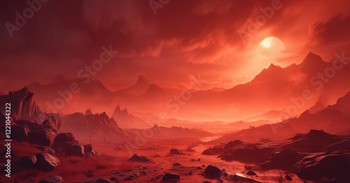 An intense red mist surrounds a mysterious border , ghostly outline, smoky veil, dreamy landscape