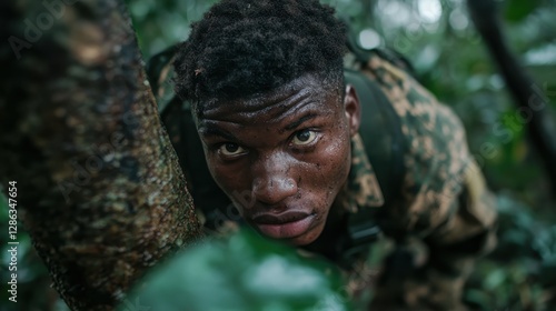 An intense soldier clad in camouflage peers through the dense foliage of a jungle, illustrating themes of bravery, survival, and the reality of military life.