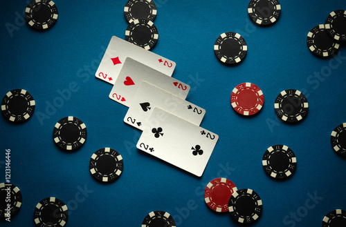 An interesting poker game takes place on a blue table with a combination of four of a kind or quads and chips from the winnings, which creates an exciting atmosphere for the players