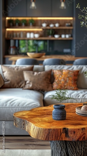 An interior area with a sawn-wood table top against the backdrop of a sofa