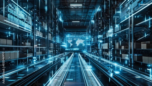 An interior of a futuristic warehouse with glowing holographic displays and digital interfaces transporting packages. Logistics concept. Stock.