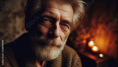 An intimate portrait of an older man with a story. The composition highlights his weathered face and gentle eyes, surrounded by warmth.