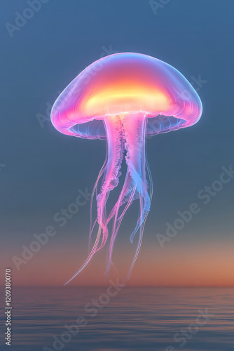 An intricate 3D rendering of a translucent jellyfish ascending towards a radiant sunset, with warm hues blending into the peaceful, still ocean below,