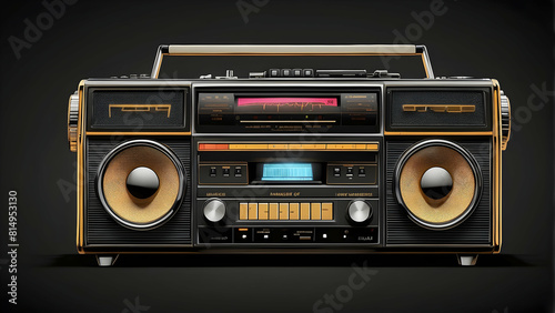 An intricate depiction of a black boombox with luxurious golden accents on a dark backdrop