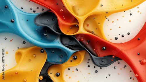An intricate fractal design in red, yellow, blue, and black colors, with a shiny, textured acrylic fluid drop mix creating a symmetrical and futuristic abstract art background.