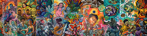 An intricate mural featuring a kaleidoscope of colors and images reflecting the energy and diversity of Mexican society.
