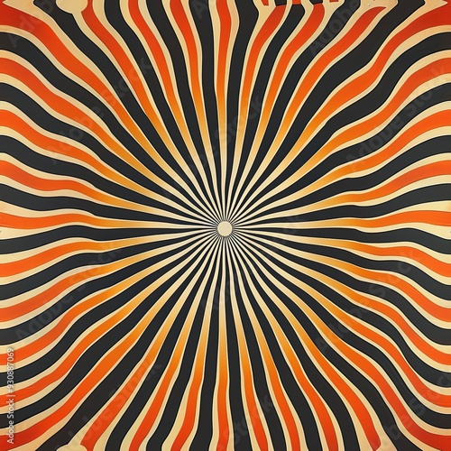 An intricate star pattern with swirling orange and yellow lines creates a hypnotic effect. This psychedelic design, featuring burst lines and twisted swirls, art installations, and posters.