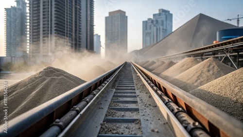 An intricate view of the conveyor belts transporting gravel and sand with dust swirling in the air. The gritty texture of the aggregates juxtaposes the sleek facades of the new