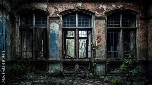 An intriguing and mysterious photo of an abandoned building, with peeling paint, broken windows, and a haunting atmosphere.