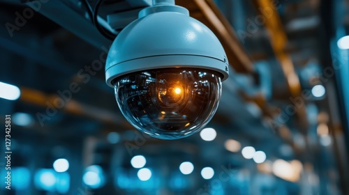 An intriguing image of a state-of-the-art surveillance camera with illuminated features in a bustling industrial environment, symbolizing advancement in security solutions.