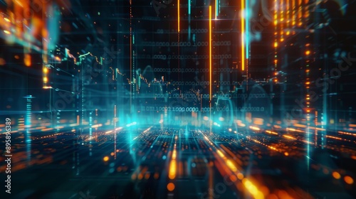 An investment graph chart financial analyze symbol seen on a 3D futuristic business monitor screen. A digital crypto currency money management idea seen on a trading graph chart financial analyze