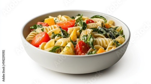 An inviting bowl of traditional Italian pasta primavera, filled with colorful vegetables and a light sauce, perfectly presented on a white backdrop to emphasize the dish's freshness.