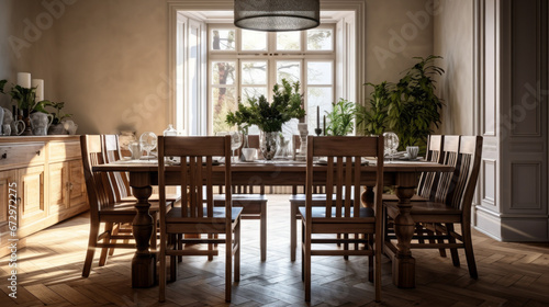 an inviting dining room with a large wooden table and six chairs and a chandelier