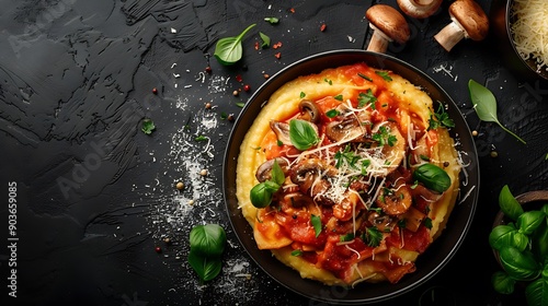 An inviting dish of creamy polenta with rich mushroom ragout, sprinkled with Parmesan cheese, on a dark rustic table. Warm lighting emphasizing the rich colors and textures of the polenta and ragout.