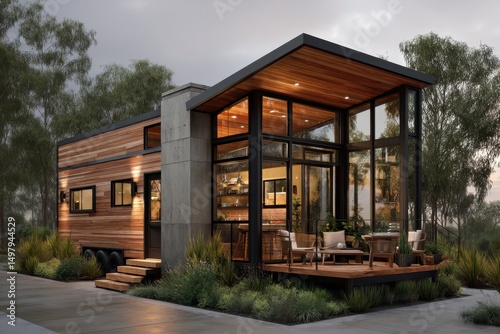 An inviting tiny house with wooden siding and large windows, blending modern design with nature, featuring a cozy outdoor deck and lush greenery, symbolizing sustainable living.