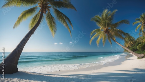 An irregularly shaped palm tree on a scenic tropical shoreline with tranquil water