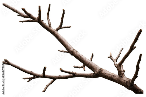 An isolated bare tree branch stretches across a white background, emphasizing its png, transparent nature for artistic projects