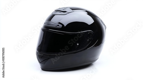 An isolated black motorcycle helmet rests against a white backdrop, its glossy exterior absorbing the light.