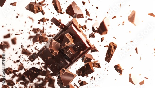 An isolated chocolate bar mid-explosion, with chunks and cocoa flying against a white background, emphasizing the dynamic action of breaking apart