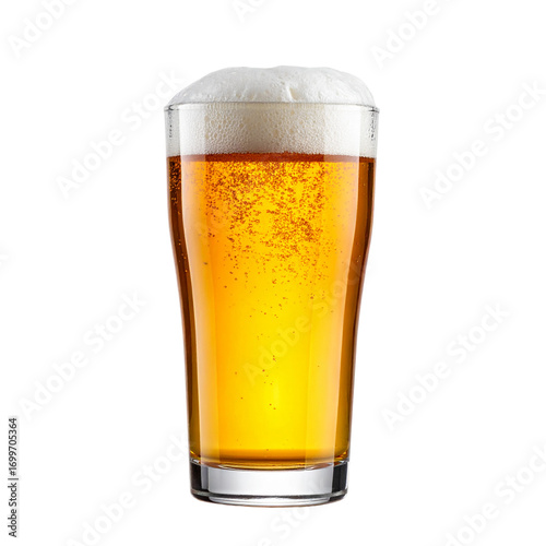 An isolated glass of cold golden lager beer with a frothy head on a white background