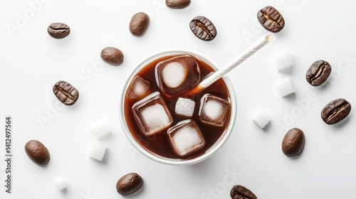 An isolated glass of refreshing iced coffee with a straw and sugar.