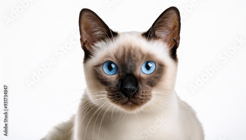 An isolated image of an elegant Siamese cat on a white background, with its sleek body and striking blue eyes, perfect for pet-themed content or feline-related projects.