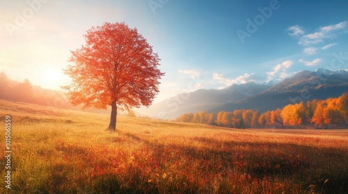 An isolated tree rises elegantly in an autumn meadow, surrounded by the warm hues of the season, creating a peaceful and reflective atmosphere in nature.