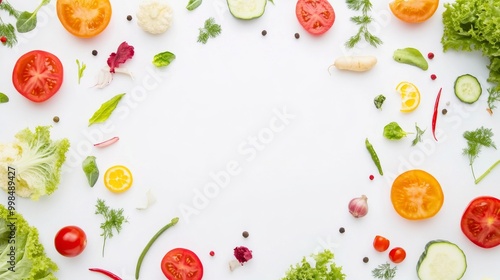 An isolated white background is accompanied by a wide collage of fresh fruits and vegetables.