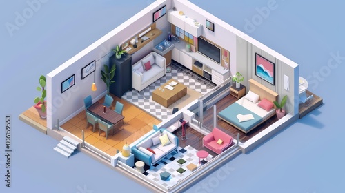 An isometric 3D design of a house interior offers a detailed look at a modern, welldecorated home that combines style with functionality, Sharpen banner with space for text