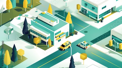 An isometric vector illustration of an outdoor commercial block scene. copy space for text.