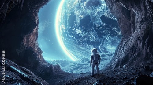 An lonely astronaut explore alien land landscape with giant planet and mountains. Fantasy wall paper.