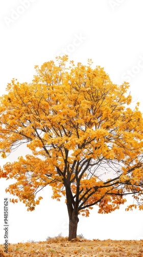 An oak tree full of golden colored leaves isolated on a white background.